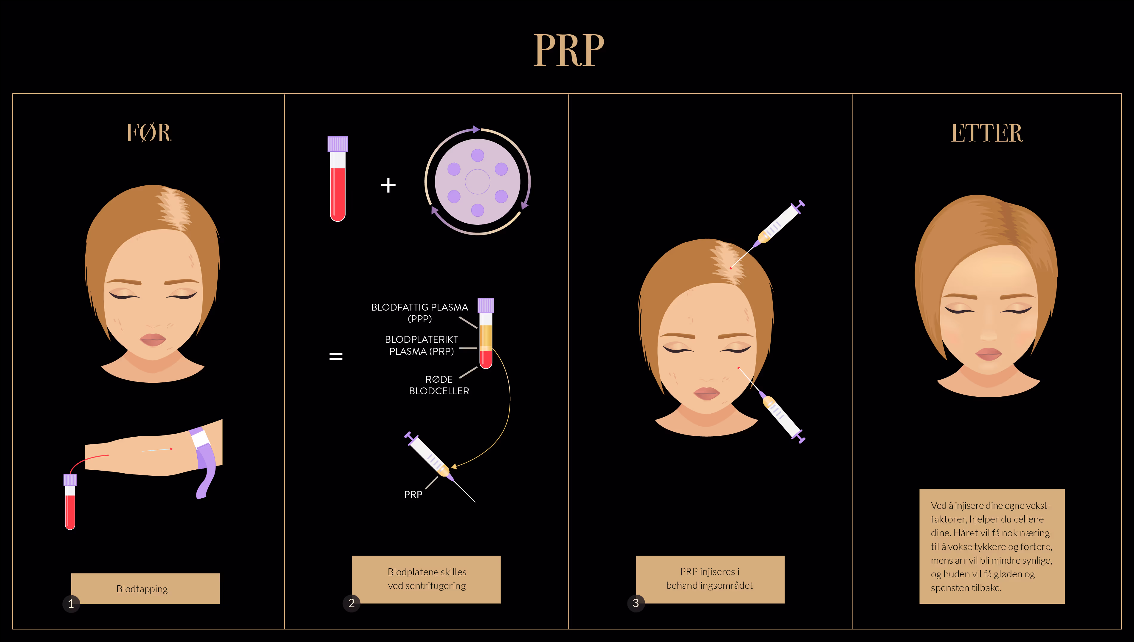Først tar vi en liten blodprøve. Blodet sentrifugeres slik at vi får ut det blodplaterike plasmaet. Deretter injiserer vi PRP skånsomt i området du ønsker å behandle, enten i ansiktet eller i hodebunnen. Hele prosessen er medisinsk trygg, rolig og tar som regel under en time.